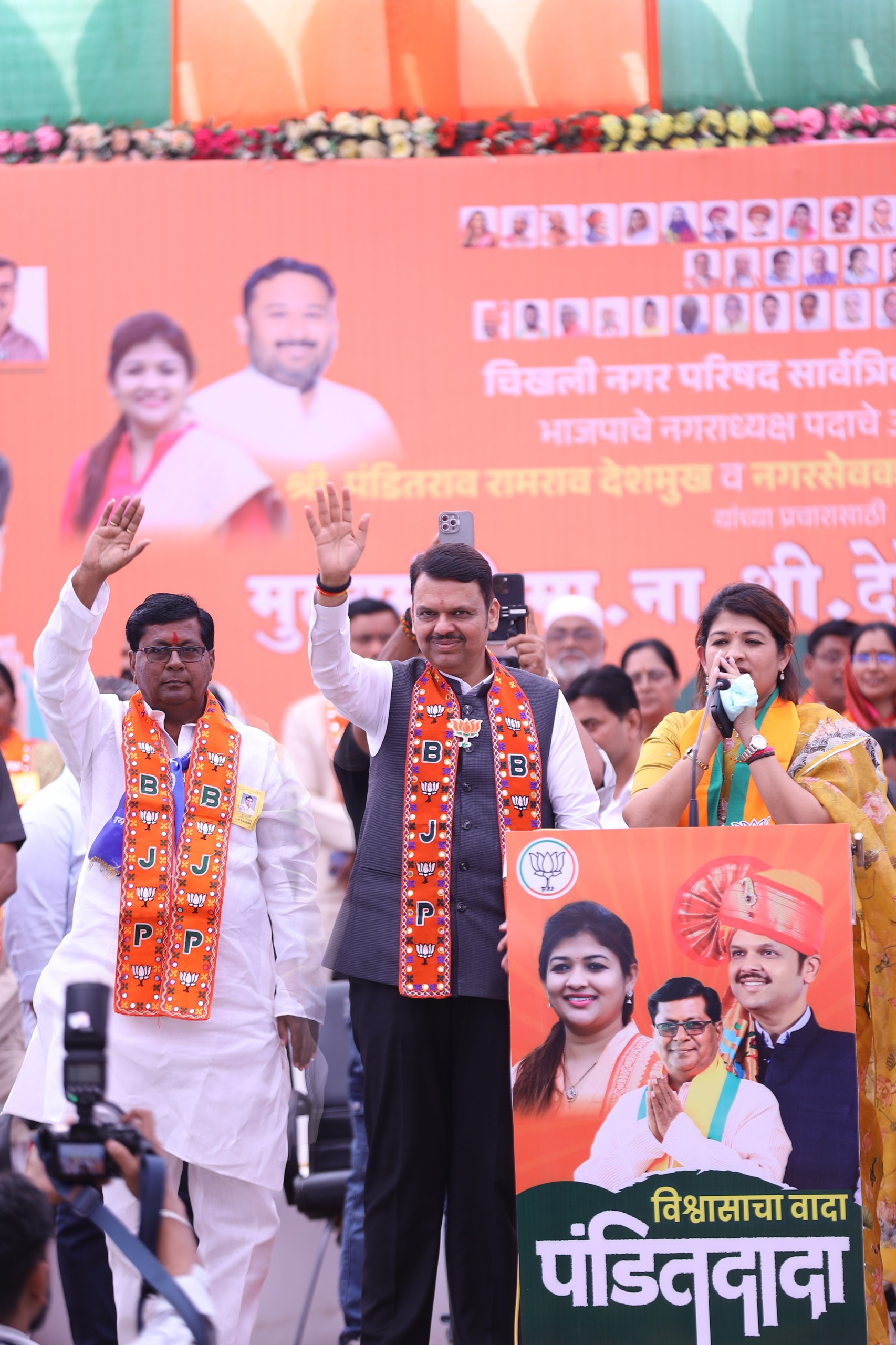 या वेळी आमदार श्वेता महाले यांनी मुख्यमंत्री फडणवीस यांचा “विदर्भाचा कोहिनूर” असा गौरव करताना, “देवेंद्रजी जेव्हा-जेव्हा चिखलीत येतात, तेव्हा या राजकीय चिखलात कमळच फुलते. त्यामुळे आजची सभा ही विजयाची सभा ठरेल,” असे आत्मविश्वासाने सांगितले. “श्वेता महाले यांनी चिखलीचा चेहरामोहरा बदलला” — मुख्यमंत्री फडणवीस.. आपल्या भाषणात मुख्यमंत्री देवेंद्र फडणवीस म्हणाले की, “चिखलमय रस्त्यांमुळे चिखलीला नाव मिळाले होते, मात्र तीन वर्षांत श्वेता महाले यांनी केलेल्या विकासामुळे चिखली प्रगतीच्या दिशेने धडाडीने आगेकूच करत आहे,” असे मुख्यमंत्र्यांनी गौरवोद्गार काढले. दिर्घकाळ नगरपालिका चालवणाऱ्या विशिष्ट कुटुंबावर टीका करत फडणवीस म्हणाले की, त्यांना सामान्यांचे काही देणे-घेणे नव्हते. “भाजपा मात्र भ्रष्टाचाराला कधीही स्थान देत नाही. स्वतःच्या नगराध्यक्षाने चुकी केली तरी त्याला काढून टाकण्याचे धैर्य भाजपामध्येच आहे,आणी चिखलीमध्येच आ. सौ महाले यांनी अशा भ्रष्ट नगराध्यक्षाला पदावरून काढून पारदर्शकतेचा पायंडा घालून दिला आहे ” असे त्यांनी स्पष्ट केले. विकास योजनांवर महत्त्वपूर्ण घोषणा…! आमदार श्वेता महाले यांनी चिखलीकरांसाठी,128 कोटींची पाणीपुरवठा योजना,वायझडी तलावासाठी 14 कोटी,रस्त्यांसाठी 130 कोटी,विविध प्रकल्पांसाठी 80 कोटी असे शेकडो कोटींचा निधी आणला आहे. यासाठी आमदार श्वेता महाले यांचे विशेष अभिनंदन करताना मुख्यमंत्री म्हणाले की “चिखली शहरात उभारला जाणारा छत्रपती शिवाजी महाराजांचा अश्वारूढ पुतळा हा चिखलीकरांसाठी अतिशय अभिमानाची बाब ठरेल त्याच पार्श्वभूमीवर घटनेचे निर्माते महामानव डॉ. बाबासाहेब आंबेडकर, महात्मा फुले आणि सावित्रीबाई फुले यांच्या पुतळ्यांचीदेखील त्यांनी घोषणा केली. नगरपालिकेची सत्ता भाजपाकडे देण्याचे आवाहन..! शहराच्या वाढत्या लोकसंख्येनुसार शिक्षण, आरोग्य, स्वच्छता, भुयारी गटार, घनकचरा व्यवस्थापन यांसारख्या प्रकल्पांसाठी भाजपाकडे तयार ‘विकास ब्ल्यू प्रिंट’ पुढे नेण्यासाठी भाजपा सक्षम असल्याचे सांगत त्यांनी मतदारांना पंडित दादा देशमुख यांना नगराध्यक्षपदी निवडून देण्याचे आवाहन केले. “चार इंजिनची ताकद — केंद्र सरकार, राज्य सरकार, आमदार आणि भाजपा नगरपालिका मिळाल्यास चिखलीचा विकास वेगाने होईल,” असे फडणवीस म्हणाले. अफवा पसरवणाऱ्या विरोधकांवर निशाणा..!बुलढाणा जिल्ह्यामध्ये काँग्रेसचे प्रदेशाध्यक्ष देखील राहतात व येथील प्रदेशाध्यक्ष व जिल्हाध्यक्ष यांना फक्त अफवा पसरवण्याचे काम असून संविधानाबद्दल, बॉम्बे मार्केट बद्दल आणि विविध विकासाच्या योजना बद्दल हे दोघे नेहमी अफवा पसरवत असतात असे आमदार श्वेता महाले पाटील 